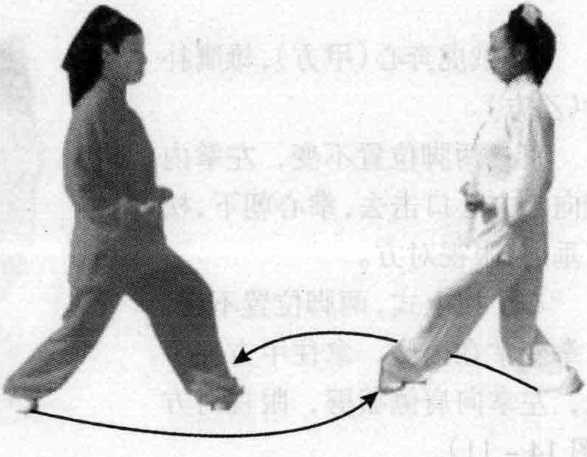 '^ ^ -jc m乙接上式,右脚向前上一步,脚尖向内扣90。,成马步,身 随向左转90°,和甲方面对面(图14-9)。