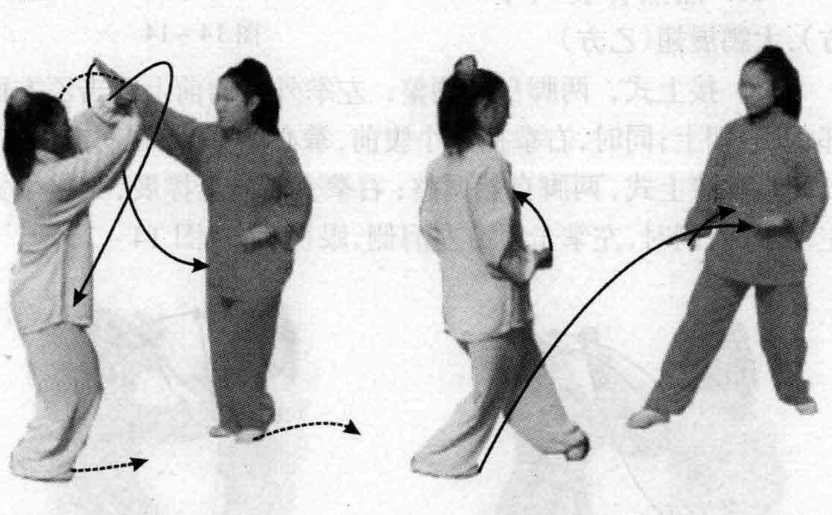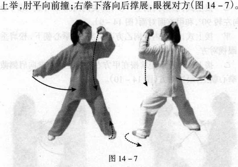 脚(图 14-13)。图 14-12 图 14-13乙接上式,左脚后退一步,身向后坐;右掌下落等甲方蹬