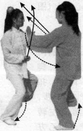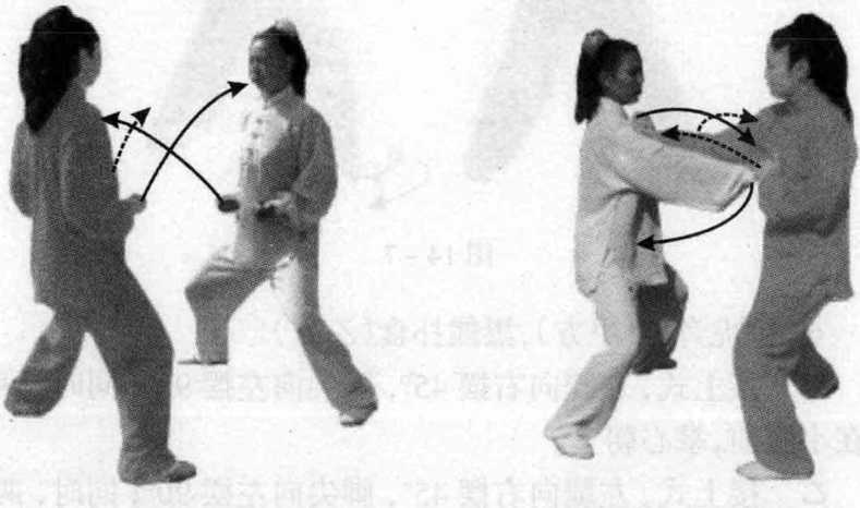 甲接上式,右脚尖向内扣45°,左脚随向右并,两腿微弯; 同时,两拳呈十字上举,架乙方手腕,眼视对方。