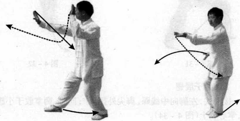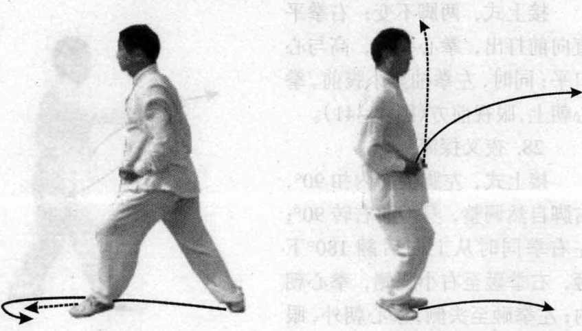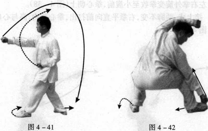 左右拳同时从上向后翻180°下 砸,右拳砸至右小腿侧,拳心朝 内;左拳砸至头侧,拳心朝外,眼 视右侧(图4-42)。 图4-40