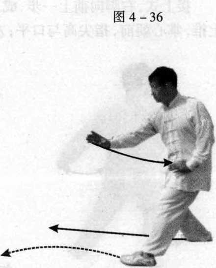 退一步;同时,右掌内旋 向前下劈,掌心朝下高 与小腹平;左掌内旋落 至小腹前,掌心朝下,眼 视前方(图4-37)。