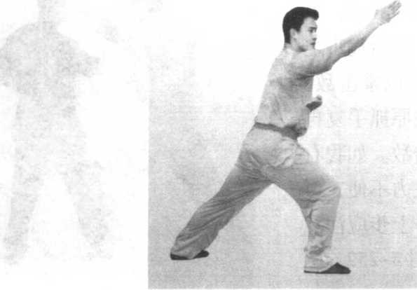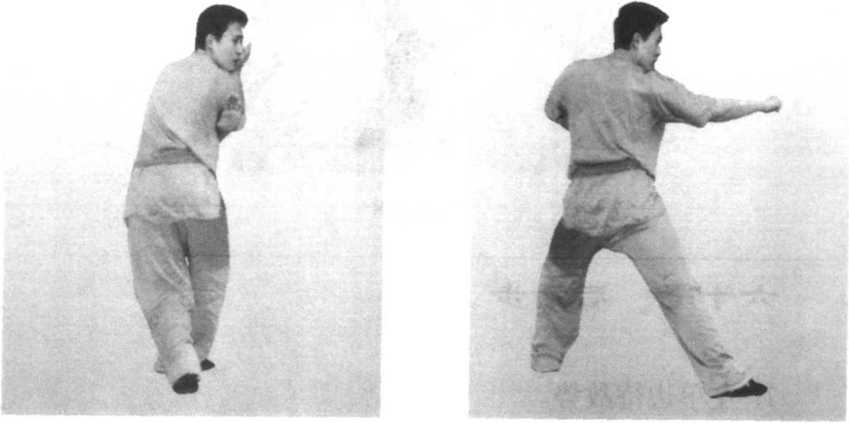 5. 冲左拳,冲右拳。上左弓步,左掌向前崩出,转右式。