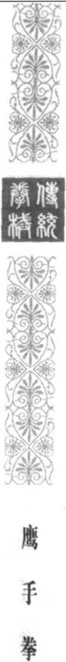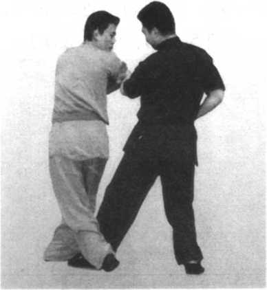 我反掌崩敌面。敌左手抓 我,我另一手翻腕叼敌腕,以 缠肘法破敌抓手,以后掏步之 腿拦绊敌腿,并配以掌击敌。 敌击来另一拳,我原抓手复再 抓敌另一手,再击敌。如我右 臂活动空间小,发力不便,可 改为肘打,但侧身上步应注意 敌击我侧背。(图5-252、图 5-253、图 5-254)