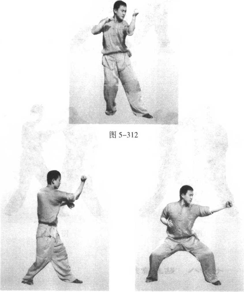 2. 上左弓步,向前转臂摔左拳。右腿跟进成丁八步。 (图 5-312)