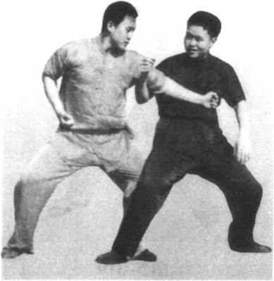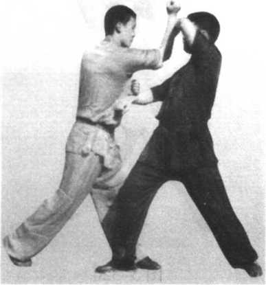 5. 右拳在左肘下向右上方握拳挑起(不宜过高),左臂在 右臂下抽出,略抬即向前左下方摔拳。