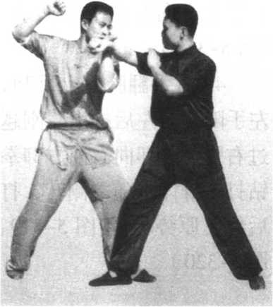 图 5-315敌向我头部胸部打右拳, 我左拳借上步之势向右摔拳, 靠砸敌右臂,右拳在左肘上方 向敌头、面部摔砸。敌封我右 拳,则我左拳在敌肋部崩打 (如封我左拳,我右拳挑甩开 敌封架之手,并以左拳向敌肋 腹部摔砸),右拳转回再向敌 头部摔击,敌抬臂封我,我再 用左拳崩敌肋。(图5-315、 图 5-316、图 5-317)