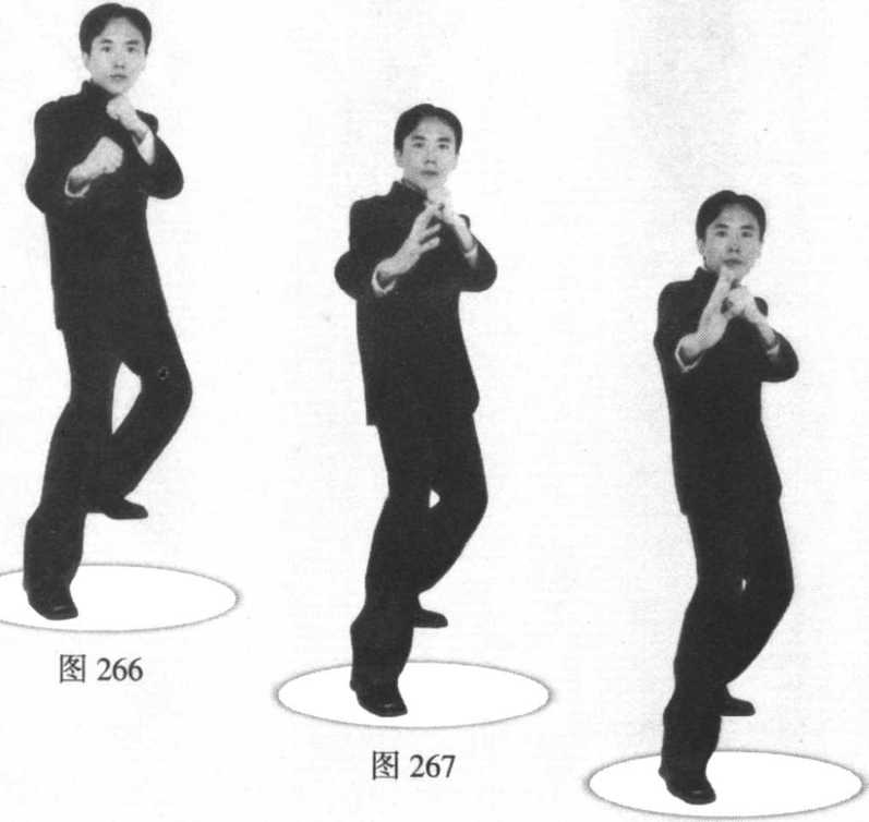 由警戒桩式起做劈掌动作。身体适度放松,保持警觉; 前手由拳变掌,合腰拧散送手,猛然从身体中线劈出, 劲力达掌指、掌根,然后迅速恢复警戒桩式(图266 ~ 图 268 )o