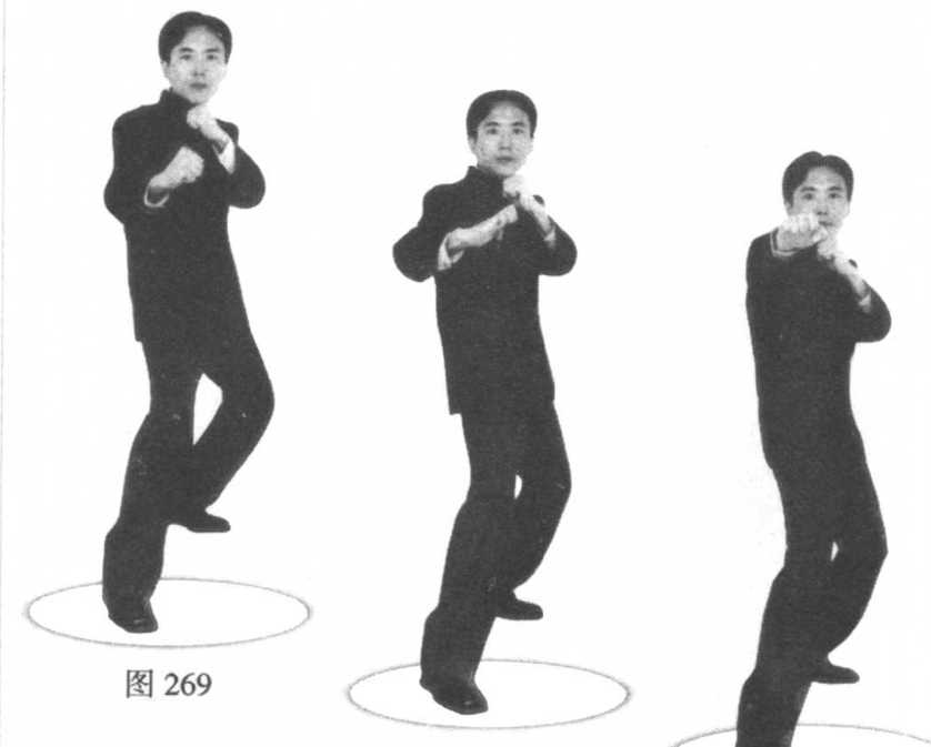 由警戒桩式起做插掌动作。身体适度放松,保持警 觉;前手由拳变插掌,四指并拢,弯曲扣紧,拇指紧扣, 从身体中线刺出,劲力达指节面,收手时迅速恢复警戒桩 式(图 269 ~ 图 271 )o