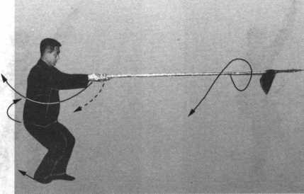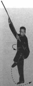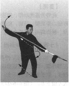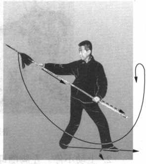 1. 身体右转,右脚向身 体左后方撤一大步成左弓步; 同时,右转身,右手从下向 外翻腕,握后把贴身经腰向 后上方提拉,使右臂伸开、 右手拉至右肩后上方;左手 同时捋把,从右下、向左上、 再向右下圈枪下拨;目视枪尖。
