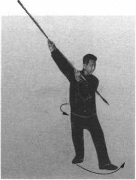 5. 上动不停。再向左转 身,左脚向左前方迈进半步, 脚尖向前成桩步,到此已弧 行一周,此步迈出应在原套 路直线上;同时,双手握枪, 使枪尖由下经前向上、向后 穿挑,在枪尖行至身前上方 时,左手向下捋把,右手向 上捋握,进行倒换把;目视 身后枪尖。(图6-6-31 )
