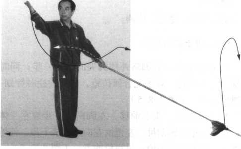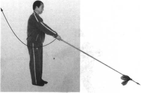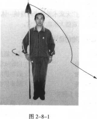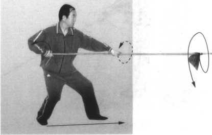 1. 重心前移,右脚略外摆脚尖向前上一步;同时,左手 外旋,右手里旋,双手配合回拉枪,使枪尖逆时针划一尺圆; 目视枪前方。(图2-8-5 )