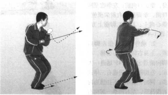 1. 两脚不动;借腰右拧, 两臂在沉肩坠肘基础上,向右 平摆90° (图1-4-13)。接着 借左膝里扣前挤,左脚向前进 方向右45。进一步,右脚随之 跟进成右提步;同时,两前臂 上弧线外旋回拉,使右上臂贴 身,拳虎口向前;左拳收至胸 口前,拳面抵在右肘尖里侧, 拳心向上;目视左脚前上方。 (图 1-4-14)