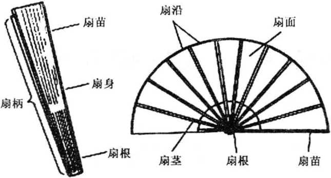 武术所用之扇,大小可因人而异。下面以社会上常用的扇为 标准,作简单介绍。(-)扇器结构扇的形状分扇棒、扇叶。合扇时的形状称扇棒,用它可以做 出各种防守与进攻的动作;打开时的形状成扇叶,下面将常用的 结构名称作一简要说明。扇柄:手握持的部分,古称大骨,较扇茎宽而厚。较细的一 端称扇根。扇柄上首部分称扇首,扇柄中间部分称扇身。扇茎:古称小骨,扇柄之间的细枝,较扇柄轻而薄,有支撑 扇面的作用。扇面:即扇的叶面。扇沿:扇面上端的弧形边沿(图6-l)o图6-1扇器结构