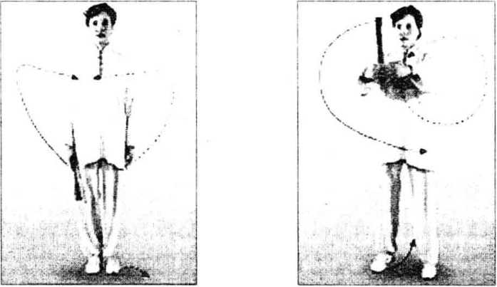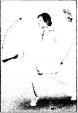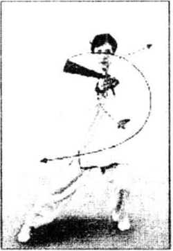 (1) 右手先合扇,继而以腰带臂,以臂带扇。收脚、横扇与 左掌绕转要同时完成。