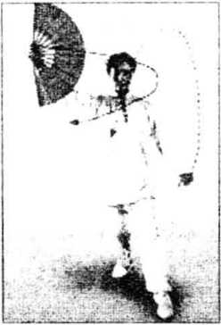 (2) 虚步与开扇要同时完成。扇骨上下竖直,扇面平行于身