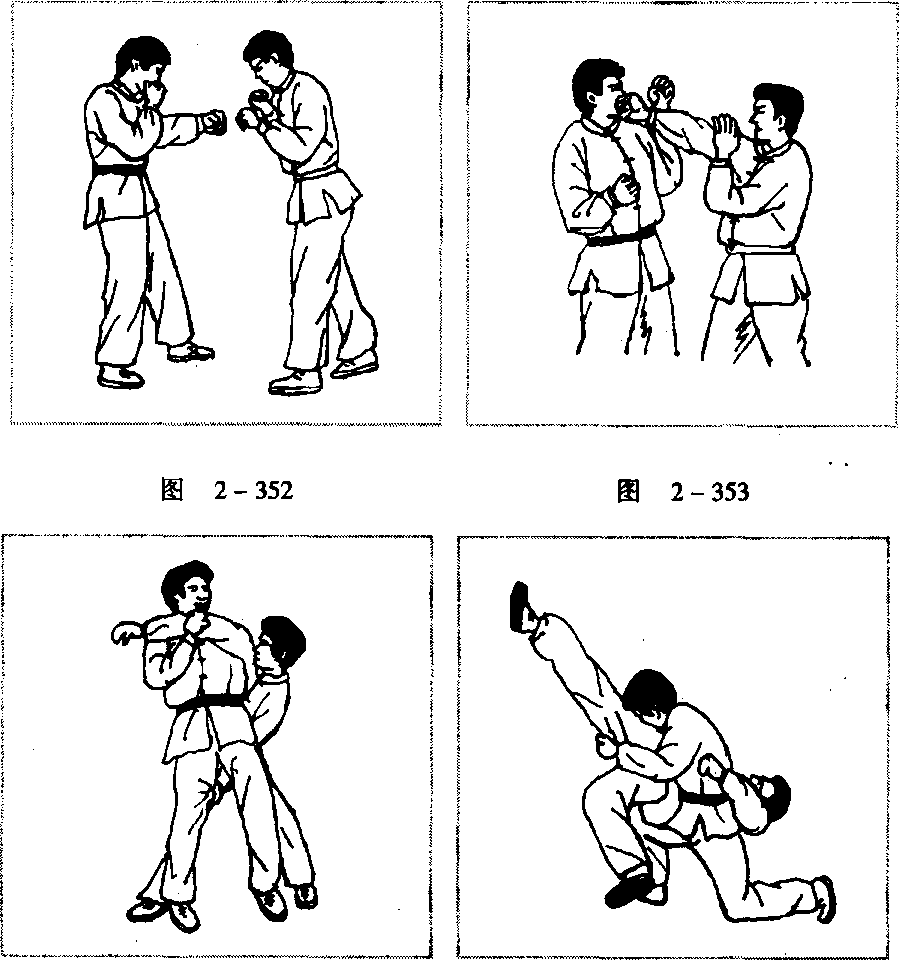 敌我如图2 - 352所示对峙,我右六合步从对方侧后进身, 右手同时击面(图2-353),若对方仰头躲闪,我则变拳为拦手 反逼其胸,左手从后向上抄其大腿(图2 - 354),身体同时右后 转,将对方摔倒(图2-355)0