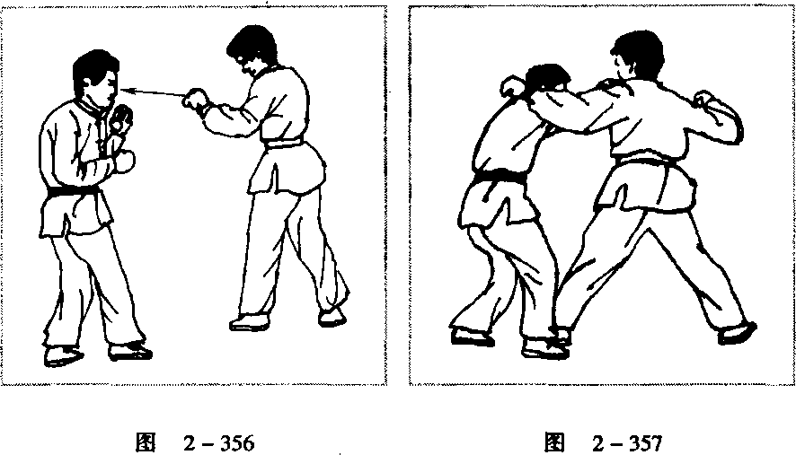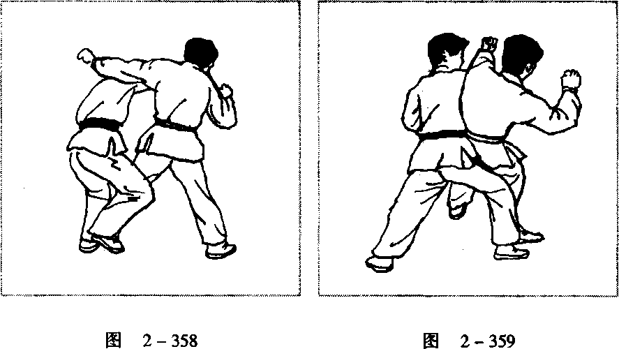 对方手臂内侧斜发一拳(图2-356、图2~357)。注意:打交叉 拳时身体应先略左闪,再发拳,方可达到既用臂部阻击了对方的 来拳,又用拳重击了对方头部的功效。打完交叉拳后,乘对方仰 头之际,立即催进一步(图2-358),右臂反拦其胸,左手抄捞 其左大腿,将对方摔倒(图2-359、图2-360)。