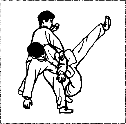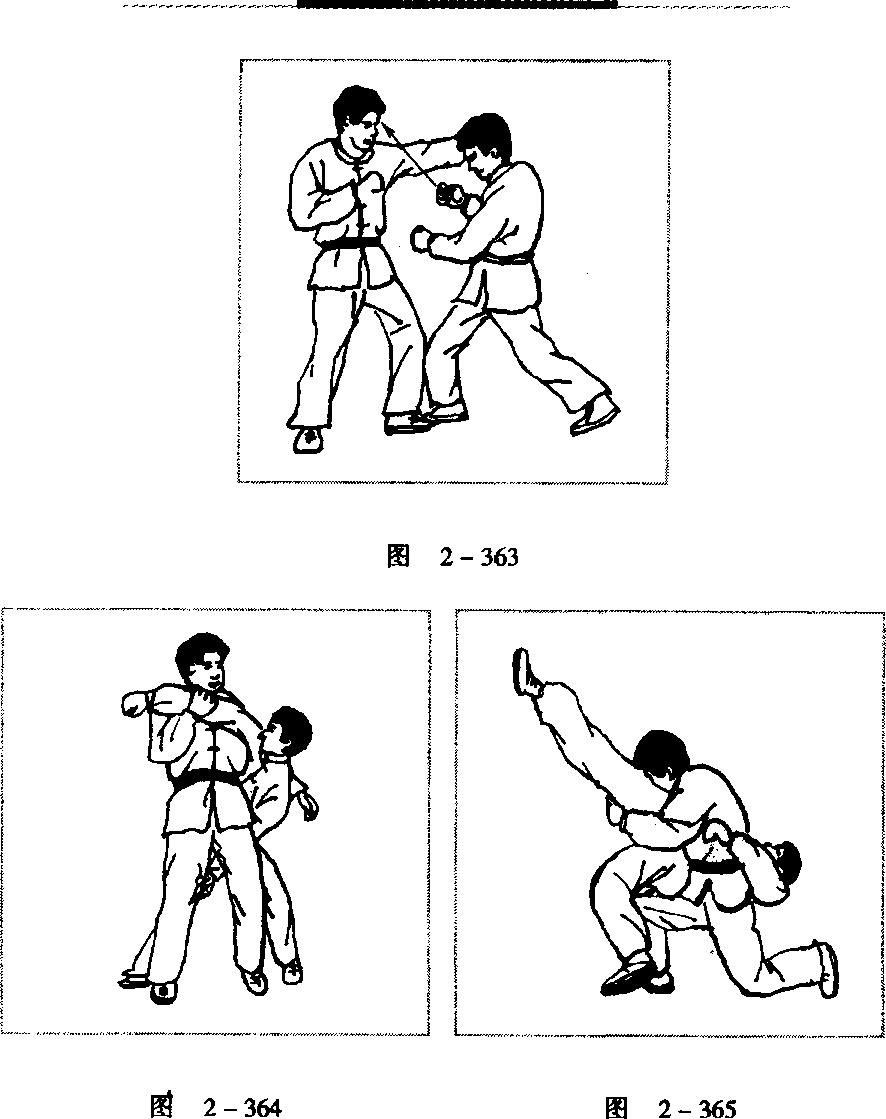 此外,还可采用打左交叉拳的方法进身。具体的做法是:敌我 对峙(图2-361),我在进身闪让来拳的同时,用左直拳由对方臂内 侧反击其面部(图2-362)。此外,还可身体左下闪让过来拳,同时 进身(图2 - 363),将右臂插到对方胸前反别其胸,左手上抄其大 腿,身体向右侧转动,将对方摔倒在地(图2-365)。