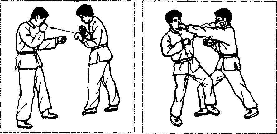 若对方先用左直拳发动进攻,我则可用打交叉拳的方法,从