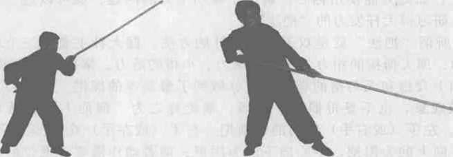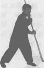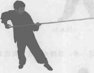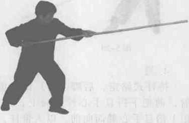持杆式站定,肩胯微旋,不拘左右划圆,带动大杆生后抽之力, 杆头遥指假想敌中线。接上动,后腿跪蹬.身涌波浪之力,通于手,