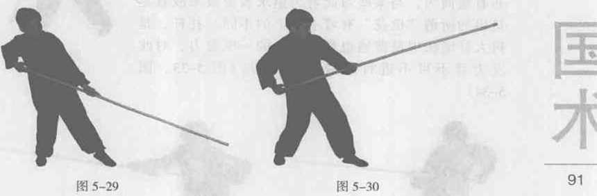 持杆势站定,身欲前而先后拉,杆欲挑而先-?沉。续接上动,走 陆地行舟步,在整体前行的同时,重心暗自上提.前把之抬与后把之 压构成合力,瞬间爆发出大杆上挑的动作,杆头斜指向上,初时宜慢 慢体会,熟练后再缩短动作时间,愈快愈好.如此反复操习(图5-29. 图 5-30)o