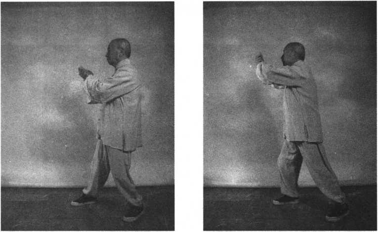 (见图7 -20),垂直下按,身体后撤,两手随身体后撤,向腹前回收(见图7 - 21 ),两手心好似扶在箱子盖上,然后内劲送达手指,好像在掀箱子盖,内劲催促 两手向前上按出,重心移于右腿(见图7 -22)。接上式,左手心翻转向上,右手 心转向下,同时向右肋后下捋左掌向上收回胸前,掌心向内,对正两乳间。身体 向左转45度,面向正西。右脚内扣45度,重心在两脚。抬起右臂,掌心向内, 左手轻轻搭于右小臂上,两臂抬起与肩平,在内劲引领下向前打挤(见图7- 23、图 7-24、图 7-25)。