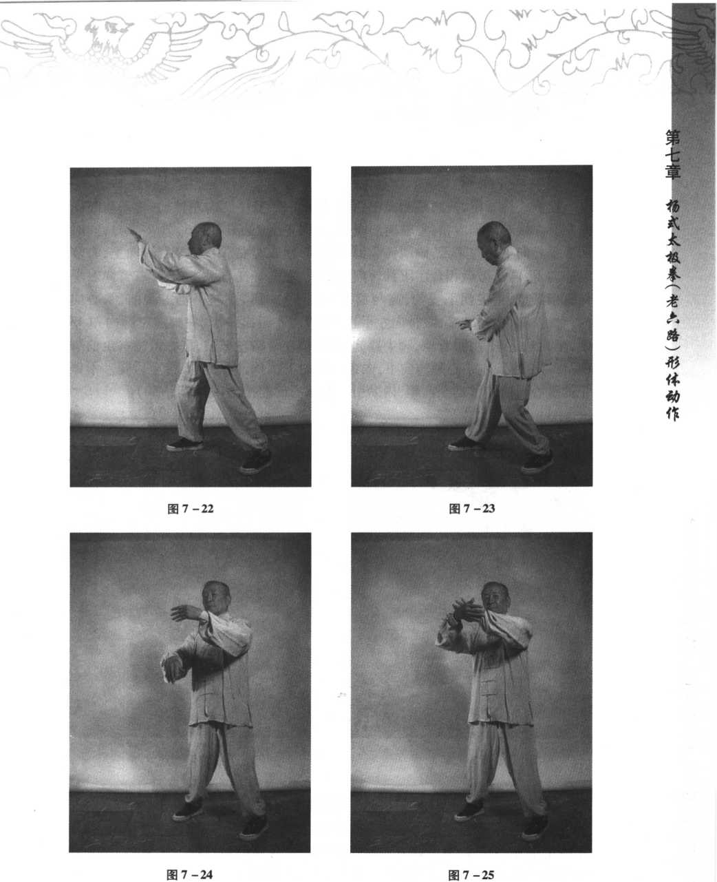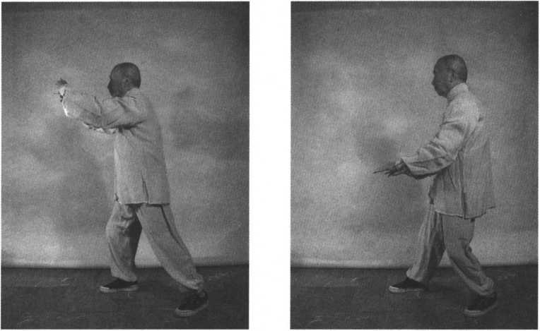 身体重心渐渐移至左腿,左腿屈膝半蹲,右腿稍直,上身随向右稍侧含胸, 同时,右手前臂内旋使手心朝下,手指朝前,左手前臂外旋使手心朝上,两手随 腰脊后移之势,屈肘缓缓向右后下方弧形抽回捋之,左手止于右小腹前,右手由 腰带动向右下捋,至右臂向右下舒伸直为止,重心在左腿。眼神随两手动,意念 观注两手,此为捋式(见图7 - 17)。