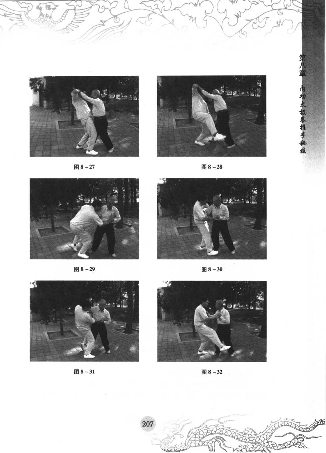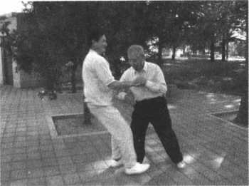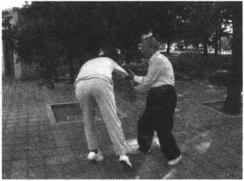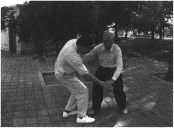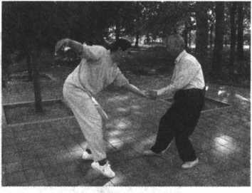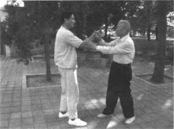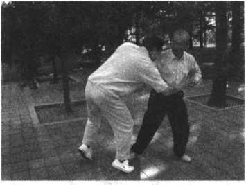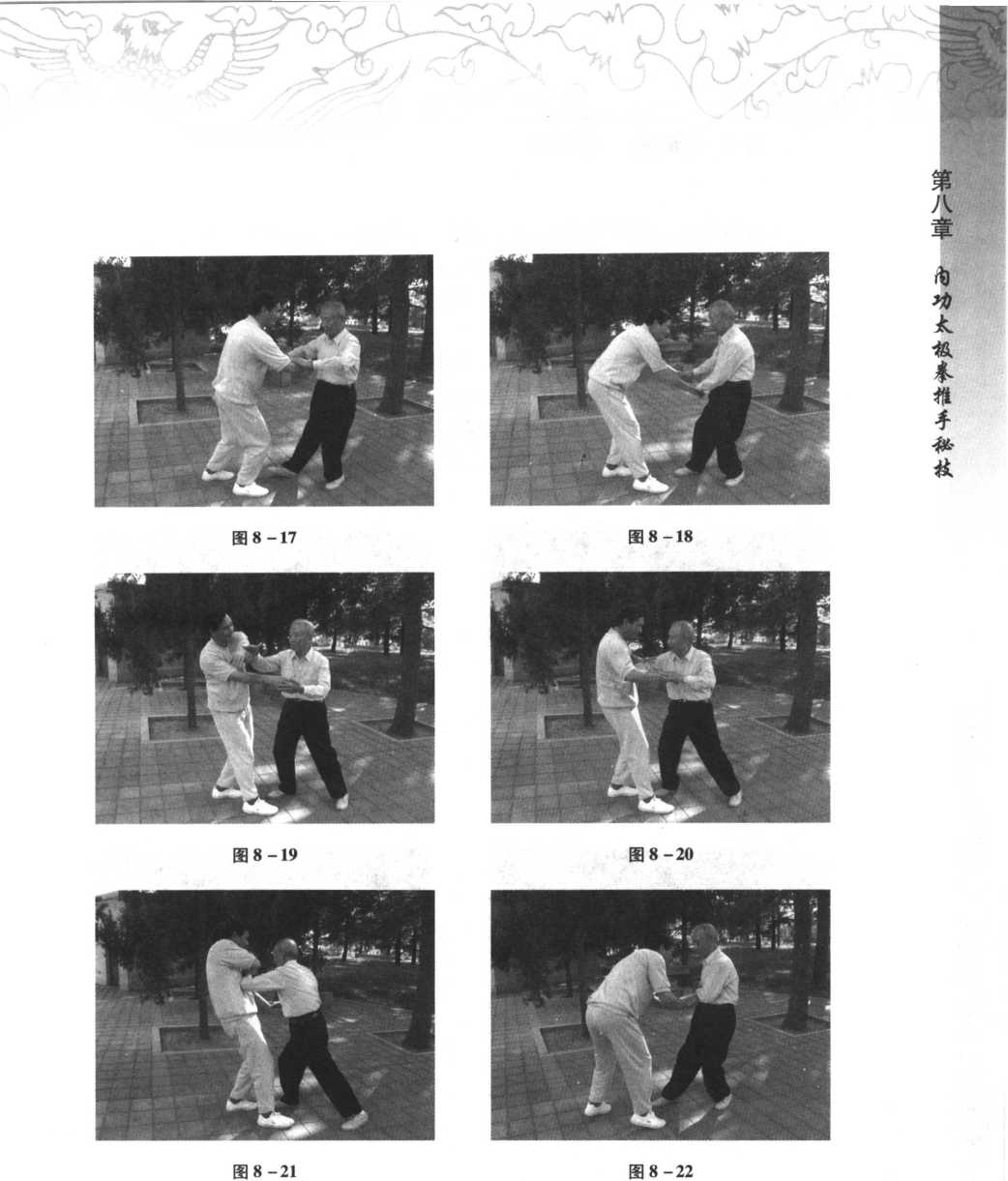 只要这样循序渐进地练习,进步很快。只要把沾粘连随劲练好了,在推手 中就占主动了,双人四正推手是基本功,又叫险步推手,就是后脚不能动,又不 许使劲。在这种条件下怎么能够把对方的重心破坏呢?就像在独木桥上,对方 要过我也要过,你回我也回。