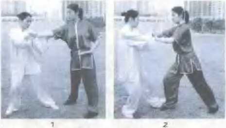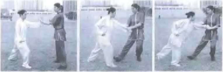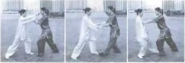 乙用"捋势”向后引屮,甲顺乙之将勢.右脚向前上一步, 同时左手向向己的右臂方向移动?随即…身体m心前移,屈右 腿,趼玍腿成行弓少,句此间时,左手手掌附于右腕内_, 以右小臂平挤乙的胸部.将乙挤出