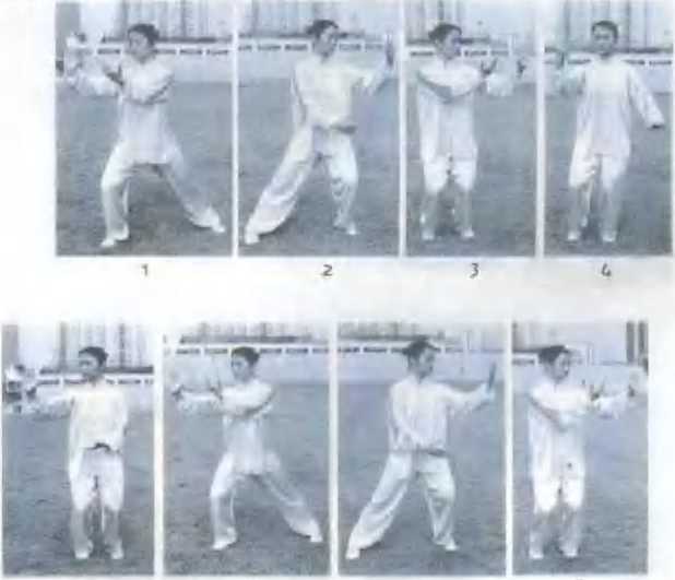左转t重心左移,左手向左运转,右手向左上别弧至左胸 前.右脚第近左脚..右手向右侧运转,左弧至右肩前,右 手翻转箏心向行,左腿向左撗跨一步