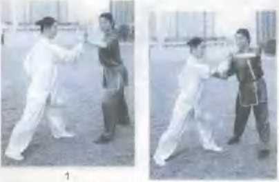 随即甲右脚向前上一步,间时左手由前向下.向后弧形带拉,