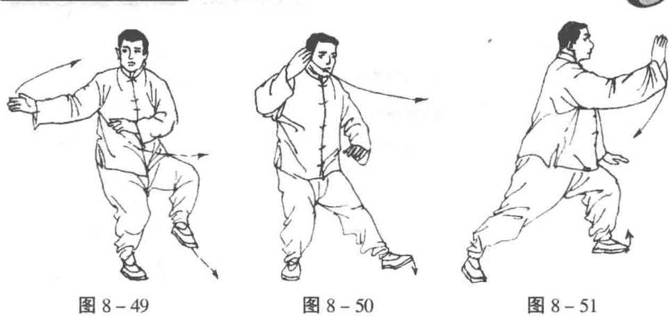 经右臂内侧向前推出,右拳弧形向下抽回目视前方(图8-55)。