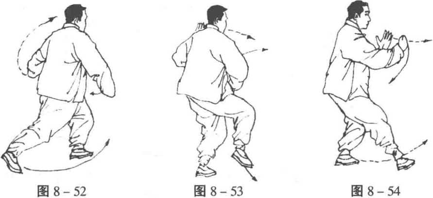 1. 转体握拳 身体重心不变,无明显后移,左脚以脚跟为 轴,脚尖外撇45度,身体逐渐左转,右脚跟提起,同时随转体左 掌向左后划弧,掌心向下,右掌向左下移,边移边握拳手心转向 下,目平视(图8-52)