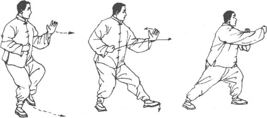 练习中强调从上式到本式有中间过渡的蓄劲过程,并明确发力 的过程,可用手从脚踝处沿劲力传递路线轻抚,以增加本体认识。