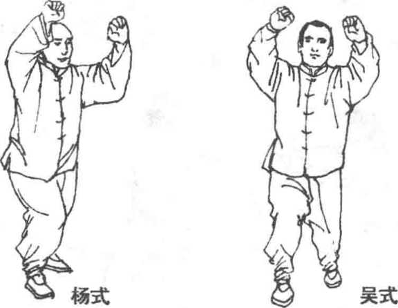 陈式、孙式、武式无此势,杨式、吴式为弓步双拳自下而上, 划弧贯击。据记载原太极拳中无双峰贯耳动作,可能为后人增加 (图 4一25)。