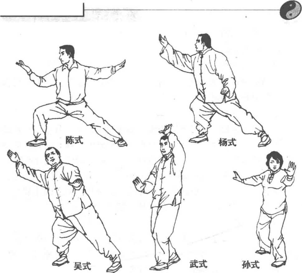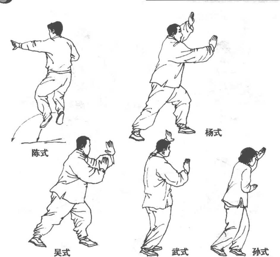 陈式野马分鬃,两臂上下绕转,提膝进步,穿掌分靠。杨式经 抱球弓步,两臂上下前后分开。吴式分开两臂时,身体前倾,头向 后看。孙式为收脚举云手,开步再云手,左右交替做。武式在胸前 上下左右划弧。五式太极拳的野马分鬃,武、孙两式手法上相似, 均在胸前划分,吴、杨前后分靠,陈式穿掌进身,各式做法不完全 相同,共同点是两臂的分绕及分列劲(图4-26)o