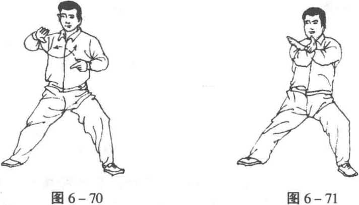 1 .转身搠捋 身微右转;同时,右拳变掌顺缠,向右后略 收,左掌仍在左肋旁微逆缠以配合(图6-70)o接着身微左转;