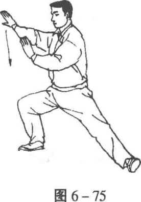 2.虚步撩挤 身体右转,重心右移于右腿;同时,右掌顺 缠向右上、左掌逆缠向左下展开(图6 - 72、73,自图6-70~72, 其中左脚仍在东北斜方,左脚位置应与图6-73同;自图6-73, 其中姿势的方向已转为符合于动作说明中的方向)。重心全部移于 左腿,右脚提回,以脚尖向前点于左脚前。同时,两手左逆、右顺 缠,左手屈肘横臂于胸前,掌心朝下;右手随着右脚向前时向胸前 上撩,两手形成合劲(图6-74)o -