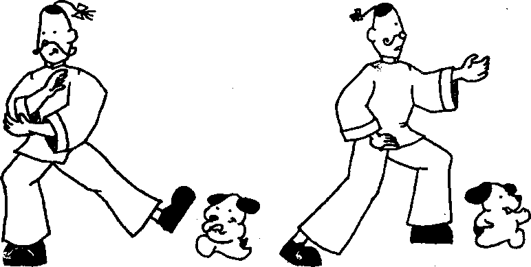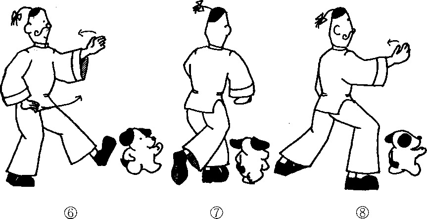⑤一面吐气,一面将身体重心慢慢移至左脚,同时,将右脚跟突出, 两手像要把马鬃分开似地,左手在前,齐眼高;右手在右腰侧,手 心向下;