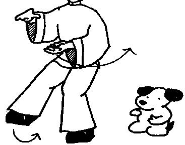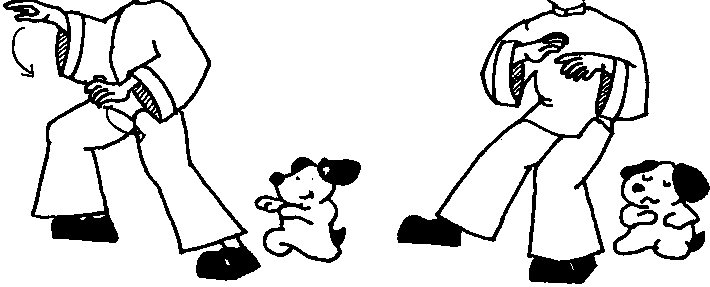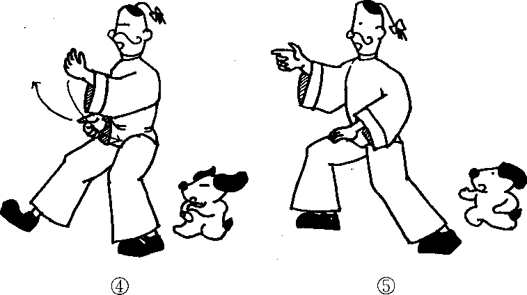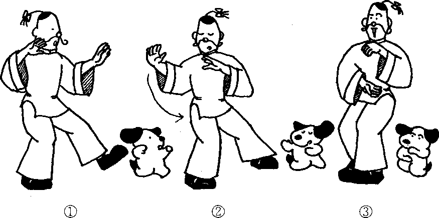 ①身体重心移至右脚,左脚尖掂起;②上身大幅度向右转(左脚尖也一起转动),身体重心移到左脚;③右手在下作抱球状,同时,将右脚收拢,脚尖踮地;④腰右转,右脚在右斜方跨出,脚跟先着地;⑤调整呼吸,身体重心移至右脚作弓步状,右手在前,左手划一圆弧放在腰侧;2⑥⑦⑥右手心朝下,置于腰的中部;⑦两腕自右至左划一圆弧;⑨