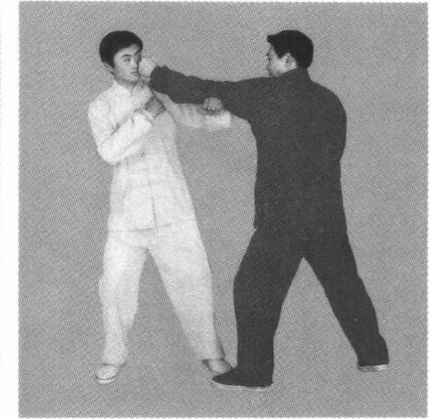 此招是上中连 击法,先取上门, 中则伤之,不中则 抢机夺势,迫其回 防,乱其架势,扰 其视觉,再发一拳 崩肋,终能胜出。