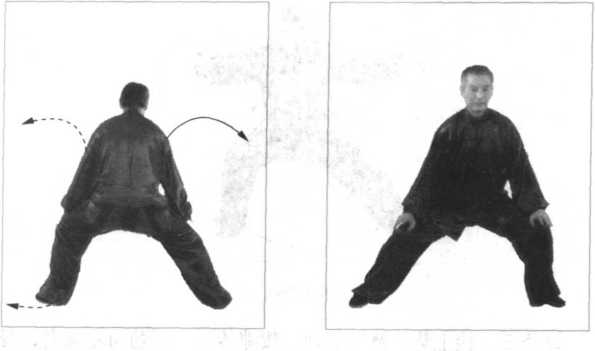 同时,松左胯、泛右臀,双胯挣衡前卷里合,开膝合膑,双 腿里缠,十趾抓地,裆部撑圆,借助旋踝转腿之劲,上弧调裆, 重心移于右腿,乘左腿领虚之机,左足出劲向身体左侧跨小半 步,左脚尖上翘里合,以脚跟内侧铲地而出,重心偏于右腿,六 四分成。