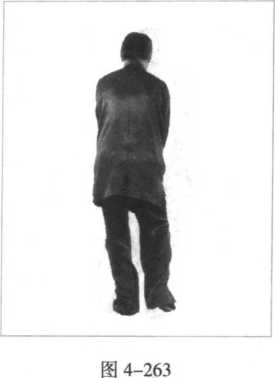 图 4一264图 4一264图 4-265图 4-265附图4-265附图4-265周身合中寓开,具有一 触即发之势,同时吸气,气 结中宫,眼注视前方,耳听 身后,兼顾两肾(图4-264. 265、附图 4-265)。