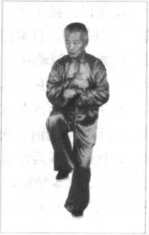 同时,松左胯、泛右臀,双胯挣衡前卷里合,开膝合膑,双 腿里缠,五趾抓地,裆部撑圆,借助旋踝转腿之劲,小腹内收, 关元与中极二穴共同内敛纳气,冲震命门。右足人劲,领膝旋 起,高与胯平,小腿松垂直竖,脚底平整,五趾微向内收,涌泉 穴虚含吸地气之意。腰劲顺左腿向下松串,注入脚底植地生根, 以助脚底之劲上翻传导。