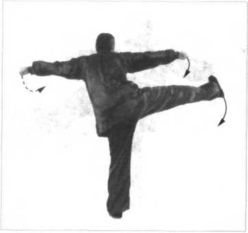 同时,松左胯、泛右臀,双胯挣衡前卷里合,开膝合膑,双 腿里缠,五趾抓地,裆部撑圆,借助旋踝转腿之劲,右足出劲, 以脚跟领劲向身体右侧横脚弹绷而出(与双手所发之劲合为一 体),脚尖向前,劲贯脚跟,脚底平整向右,五趾一松即收(劲 要一吐即收,形须一抖即松),高不过肋,低不过胯。腰劲顺左 腿向下松串,注入脚底植地生根。