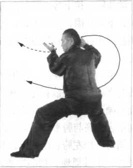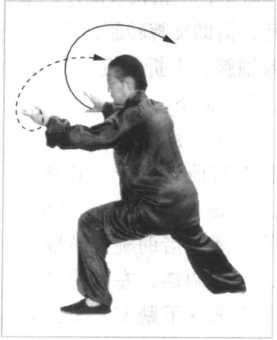 画下弧运展至腹前约40厘米。气聚轴腕,内搠外折,肘向里合, 高与腹脐平,手指直向左前方,掌心向左;左手人劲变为逆缠, 坐腕旋转,借助旋腕转膀之劲,画下弧运展至身体左前上方约45 厘米,气聚轴腕,外拥内折,肘微里合,高与眼平,手指松直向 前偏上,掌心向左。