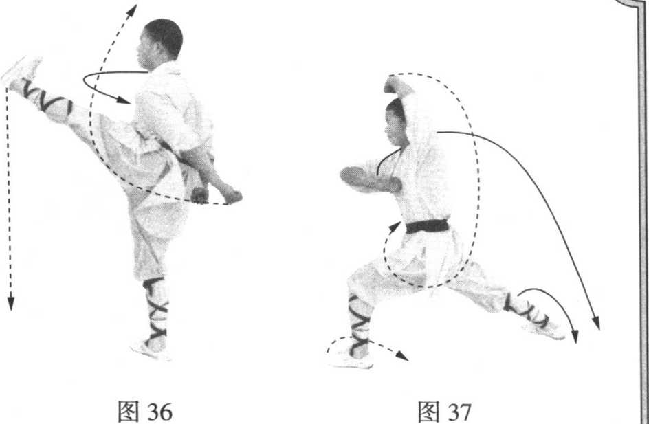 抬左腿向前、向上弹踢,左拳向前沿左腿向后、 向下劈打,右拳垂于右后侧。目视左脚(图36)。