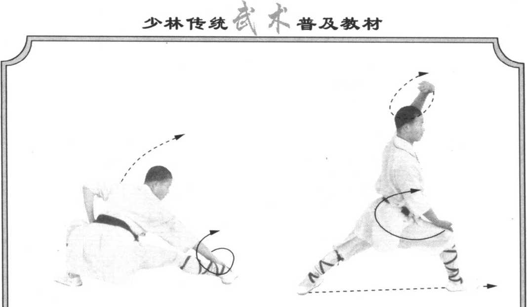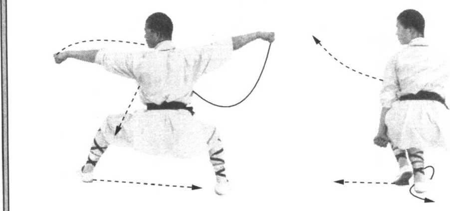 步。同时两拳变掌,右手随身向右摆手;左手端 于腰间。目视右手(图38)。