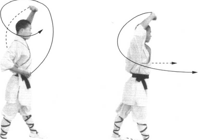 抬右脚向前上一步。右拳变掌,在头上划弧; 左掌变拳,抱于腰间。目视前方(图41)。