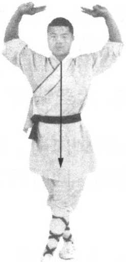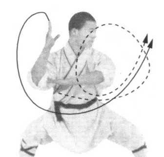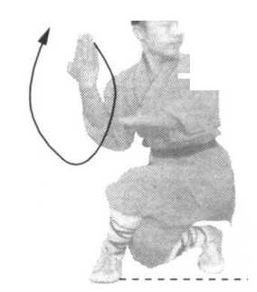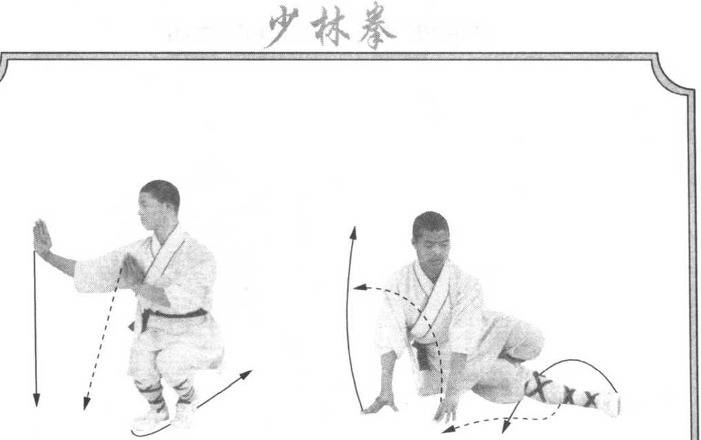轴,体向左转270度,两腿全蹲成歇步。同时两掌